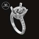 Our stately, Edwardian-inspired semi mount includes 0.47 carats of pave-set VS2-SI1 clarity, G-H color diamonds. Metal details include engraving and mill grain, which adorns the prongs and head. The detail work is reminisces of a royal crown. This handcrafted engagement ring is truly wearable art.