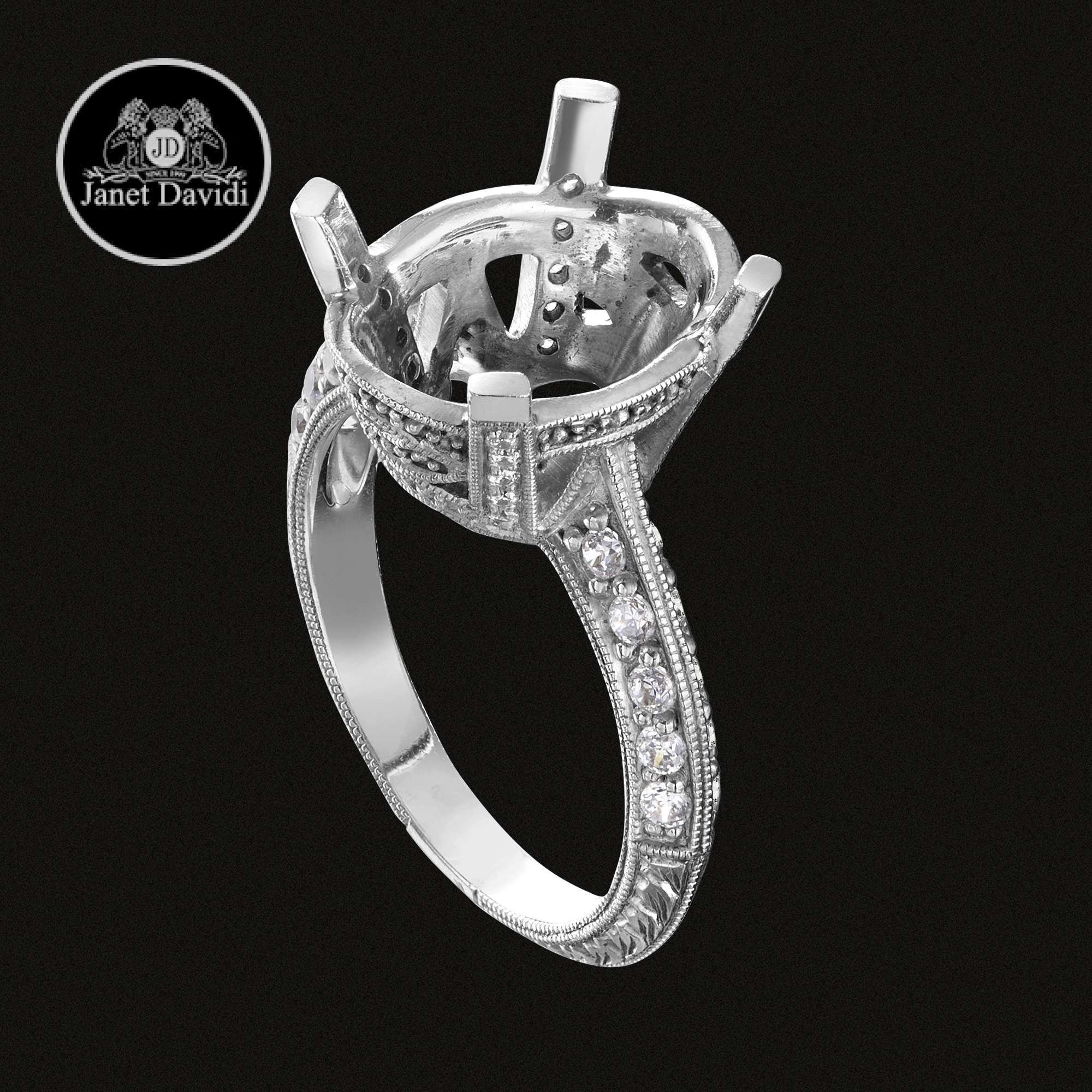 Edwardian Style Antique Inspired/ 14/18K White Gold Pave Diamonds Milgrain and Engraved Engagement Ring/ Setting Only Semi mount For Oval