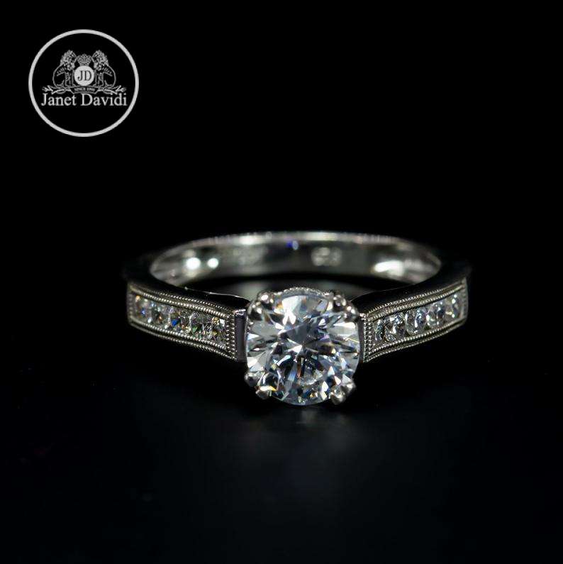 This elegant heirloom quality engagement ring is adorned with diamonds about the ring. A satin finish along the shank gives this traditional engagement ring a modern edge. The mill grain detail along the prongs is a fine example of the skilled workmanship required to create this ring. Your bride will smile every time she glances at her hand!