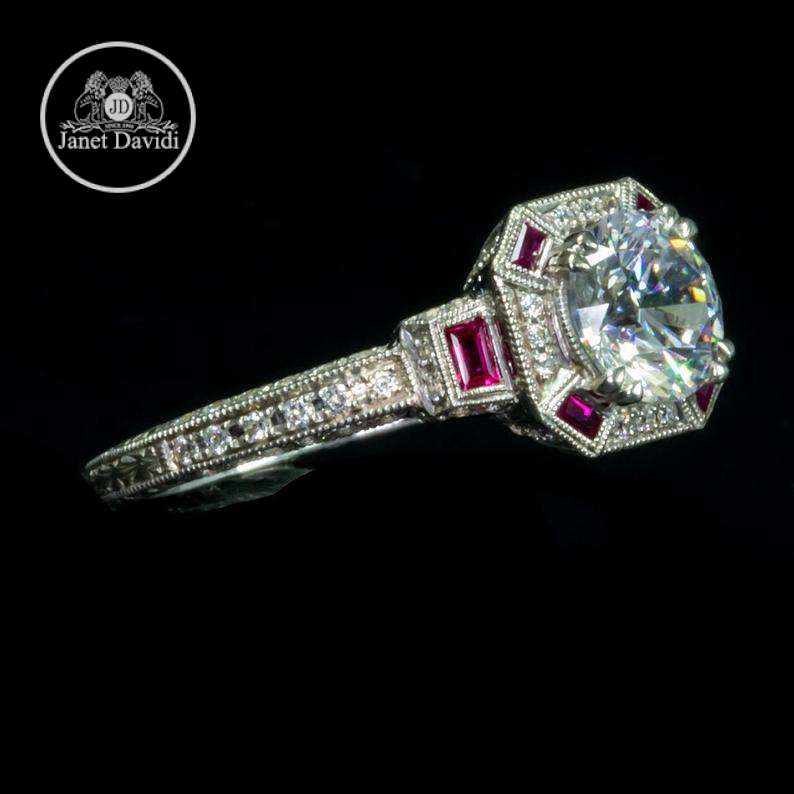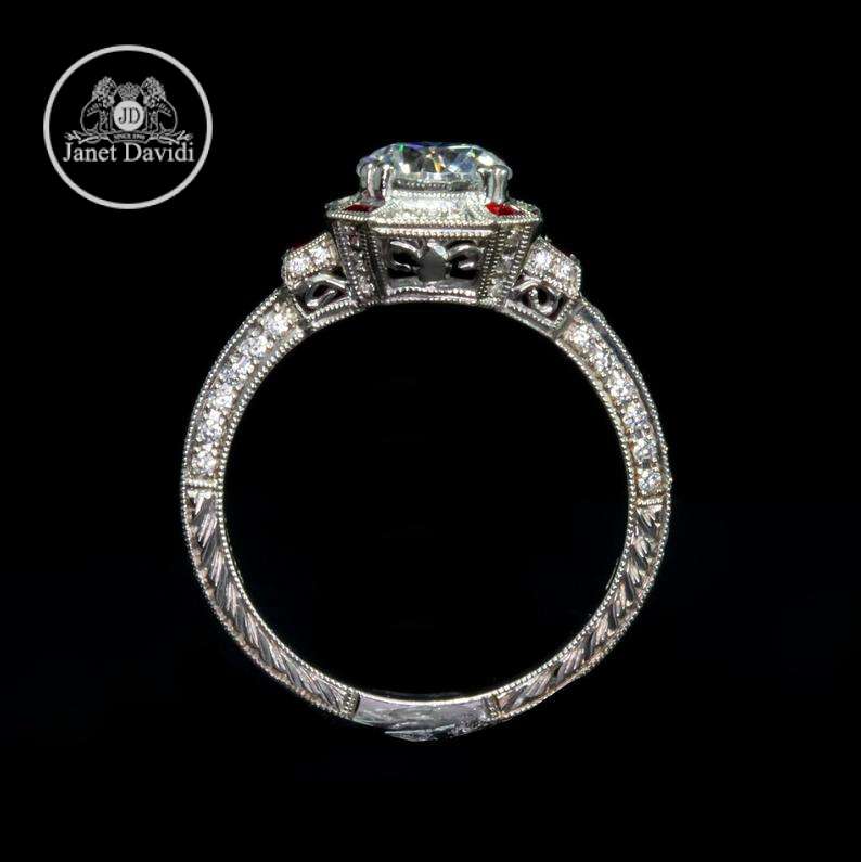 When our designer was creating this piece, she carefully considered each element of this engagement ring. The detail work is reminisces of a royal crown. She added a splash of ruby to customize it for your bride. This handcrafted engagement ring is truly wearable art.
