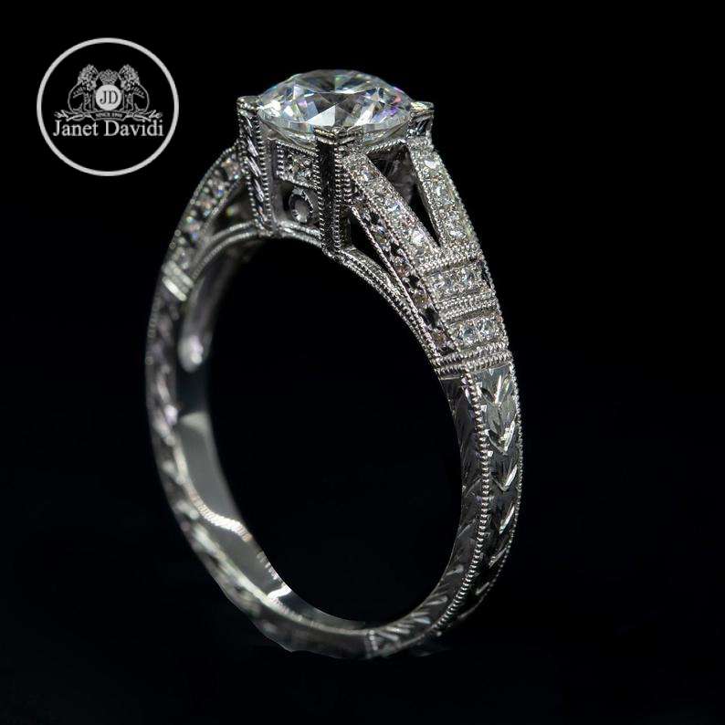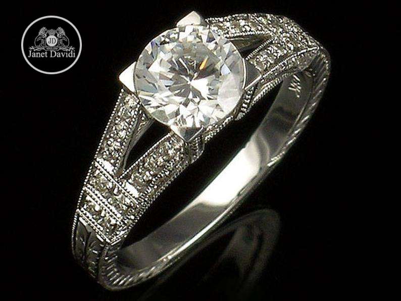 Edwardian Style Antique Inspired Engagement Ring/14 or 18 KWG Natural Diamond Mill Grained and Engraved Engagement Ring /Setting Only Mount
