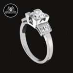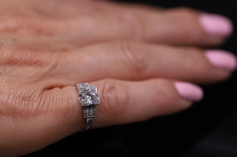 Our dainty, Art Deco-inspired semi mount includes three baguette diamonds on each side. Metal details include milgrain work around diamonds and on the top of prongs. This dainty engagement ring has a playful pattern around the band. It is simple, yet elegant and is sure to bring a smile to your beautiful bride’s face when you present it to her! Silver sample available upon request.