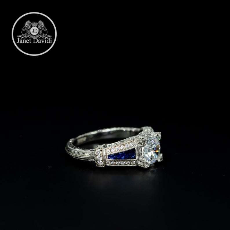 18K Blue Sapphire and Diamond Milgrain-ENGAGEMENT RINGS