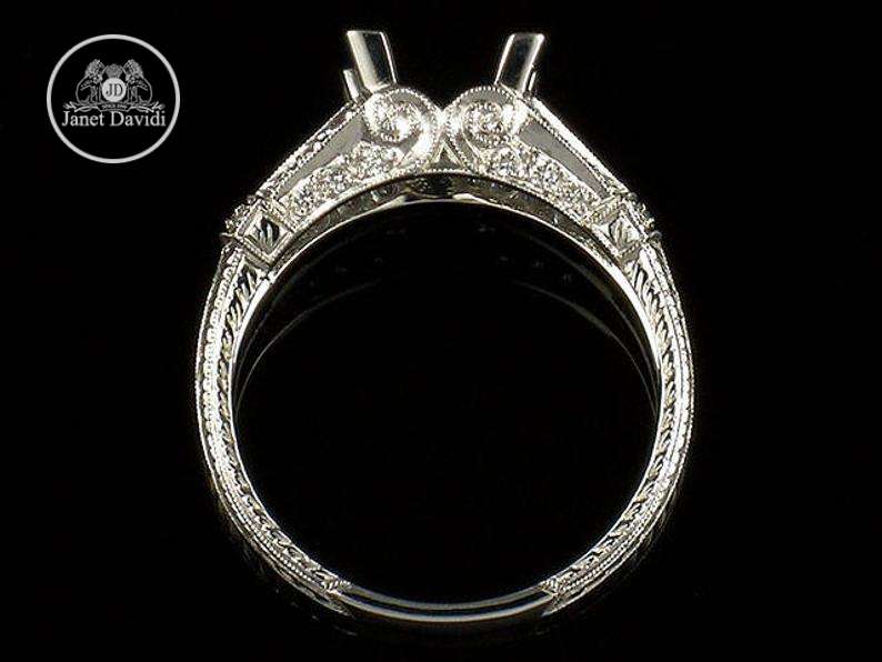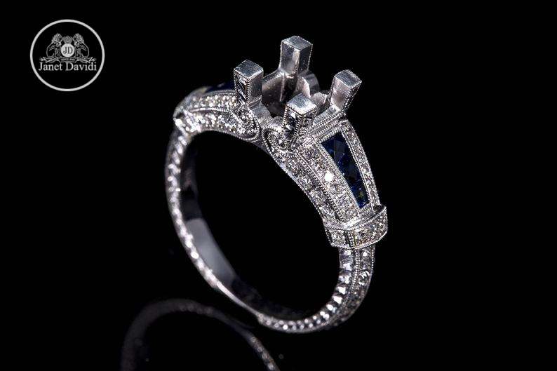 Edwardian Style Antique Inspired Engagement Ring/18K Blue Sapphire and Diamond Milgrain and Engraved Engagement Ring/Setting Only Semi Mount