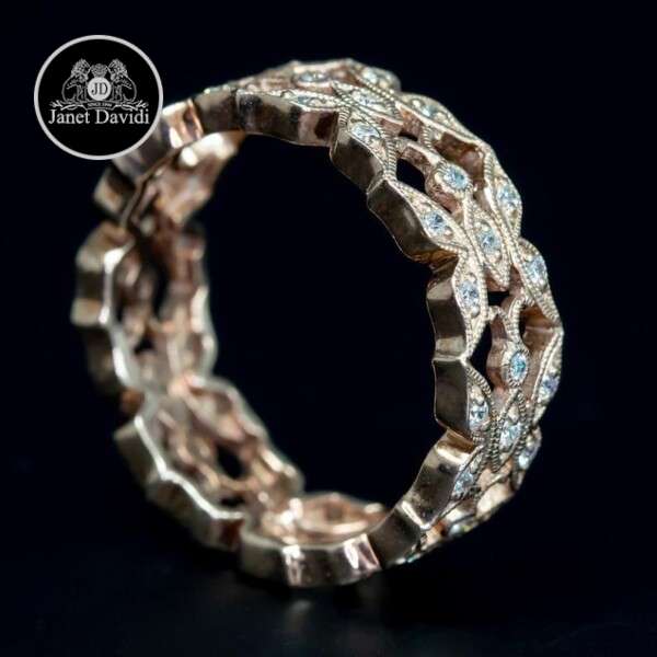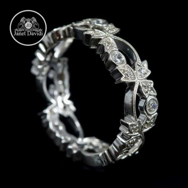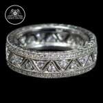 This hand crafted masterpiece was designed with the antiqued Edwardian style in mind. It’s intricate patterns were constructed by hand using mill graining that is surrounded by round brilliant cut diamonds. This unique eternity band invokes images of an Edwardian collar. It’s playful and traditional, just like your bride.