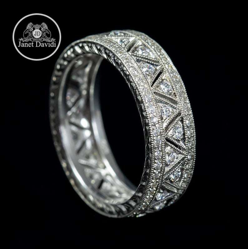 Antique Inspired Edwardian Style Wide Eternity Wedding Ring/White Gold Engraved Micro Pave Diamond Wide Eternity Ring/Wide Gold Wedding Band