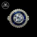 This ring paints a picture of a magnificent chandelier hanging in the halls of a castle. The light shimmers through the gems to create an unrivaled glimmer that will be echoed in your bride’s eyes when it is placed on her hand.