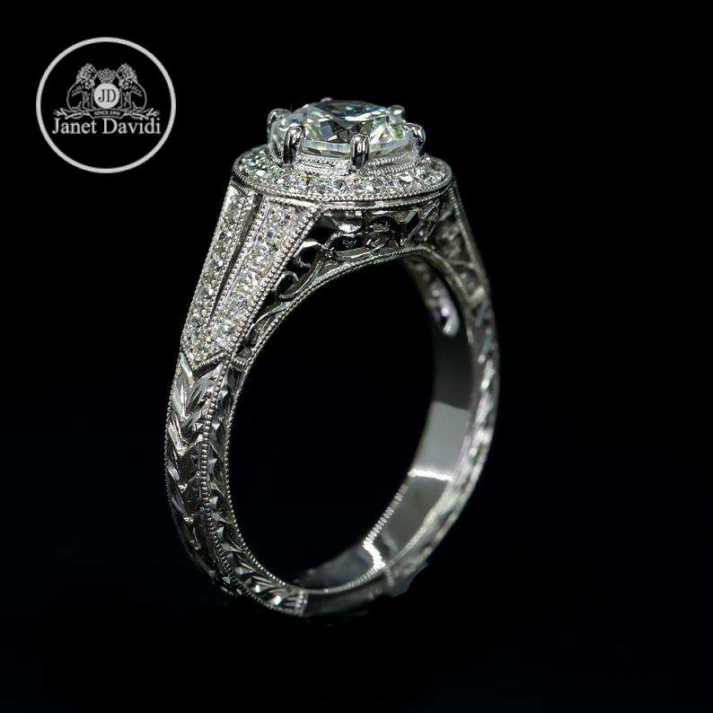 This elegant heirloom quality engagement ring is adorned with a round halo that can accommodate up to a 6.5 mm stone that is as unique as the wearer. Hand crafted engravings dance along the edges to emphasis the shank of the ring.