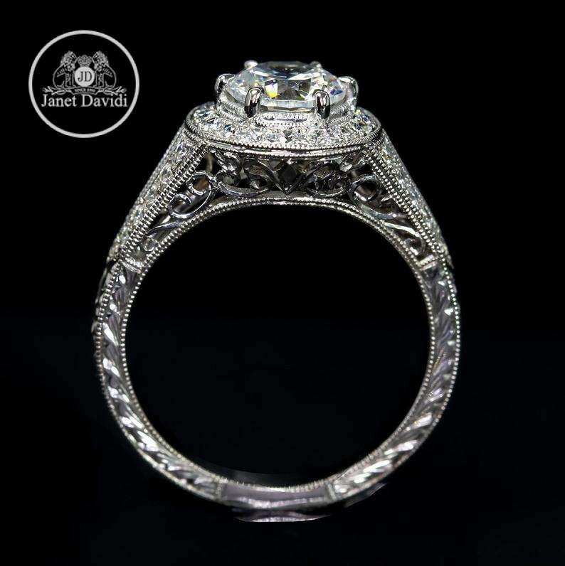 Edwardian Style Antique Inspired Halo Engagement Ring/14 , 18 W Gold Diamond Mill Grained and Engraved Filigree Engagement Ring/Setting Only