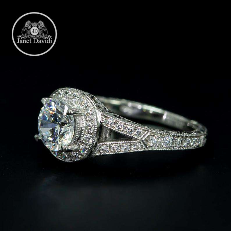 This elegant heirloom quality engagement ring is adorned with a round halo that can accommodate up to a 6.5 mm stone that is as unique as the wearer. Hand crafted engravings dance along the edges to emphasis the shank of the ring.