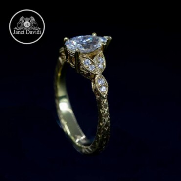 This antique styled engagement ring was inspired by nature. The diamond bezels around the center stone represent the pedals, much like the ones that will be in her wedding bouquet. The hand crafted mill grain is designed for a pear shaped center stone. Your bride will be delighted each time she looks at her hand, and she won’t be able to stop looking!