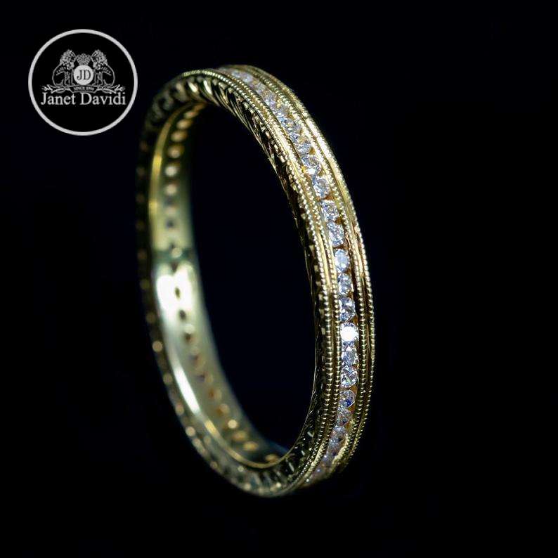 Art Deco Antique Inspired Eternity Wedding Ring/18 k Gold and Diamond Channel Set Engraved and Mill Grained Stackable Wedding Band/Gold Band