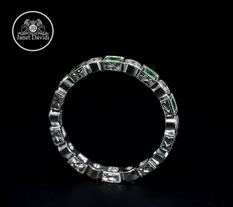 Art Deco Eternity Stackable Band/18 KWG Genuine Tsavorite and Diamond Mill Grained and Engraved Stackable Band/Eternity Gemstone Ring/Band