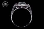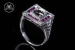 Our statement-making, low-profile Art Deco-inspired semi mount has genuine, princess-cut rubies that will frame your center stone. When you present it to her, it will take her breath away. This is a moment she’ll always remember.