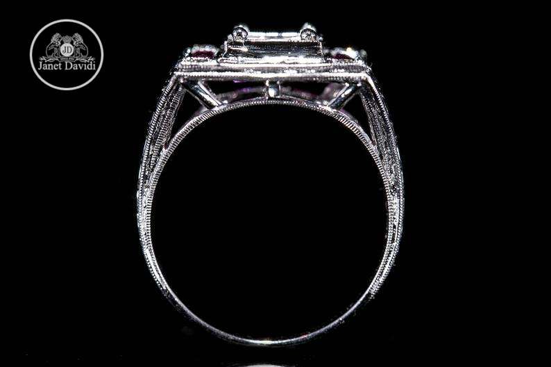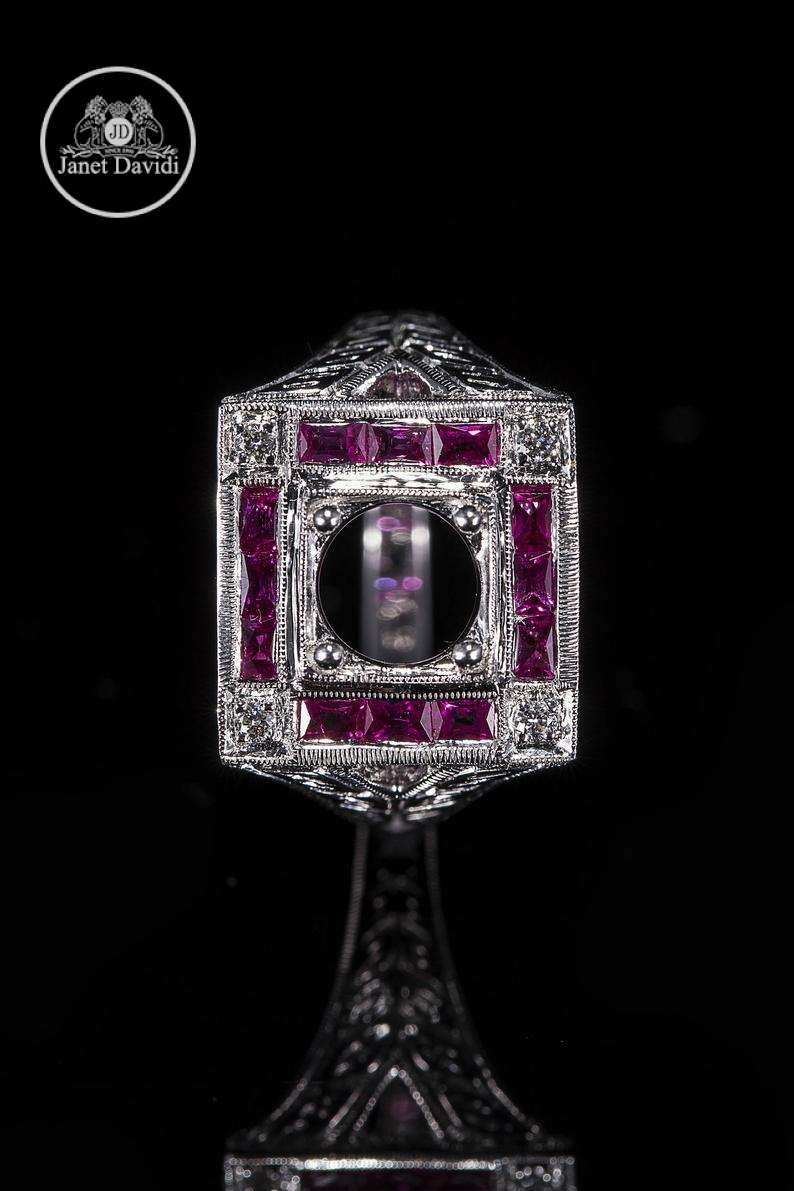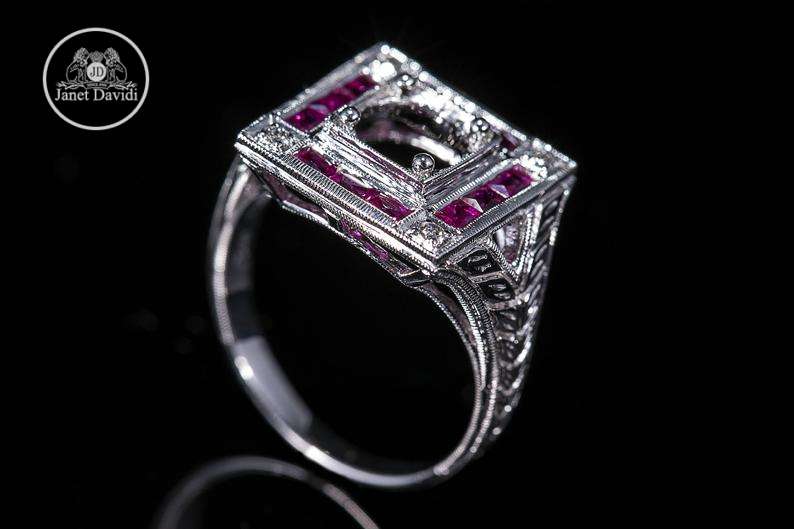 Art Deco Style Antique Inspired Engagement Ring/ 18K White Gold Genuine Ruby and Diamond Milgrain and Engraved Engagement Ring/ Setting Only