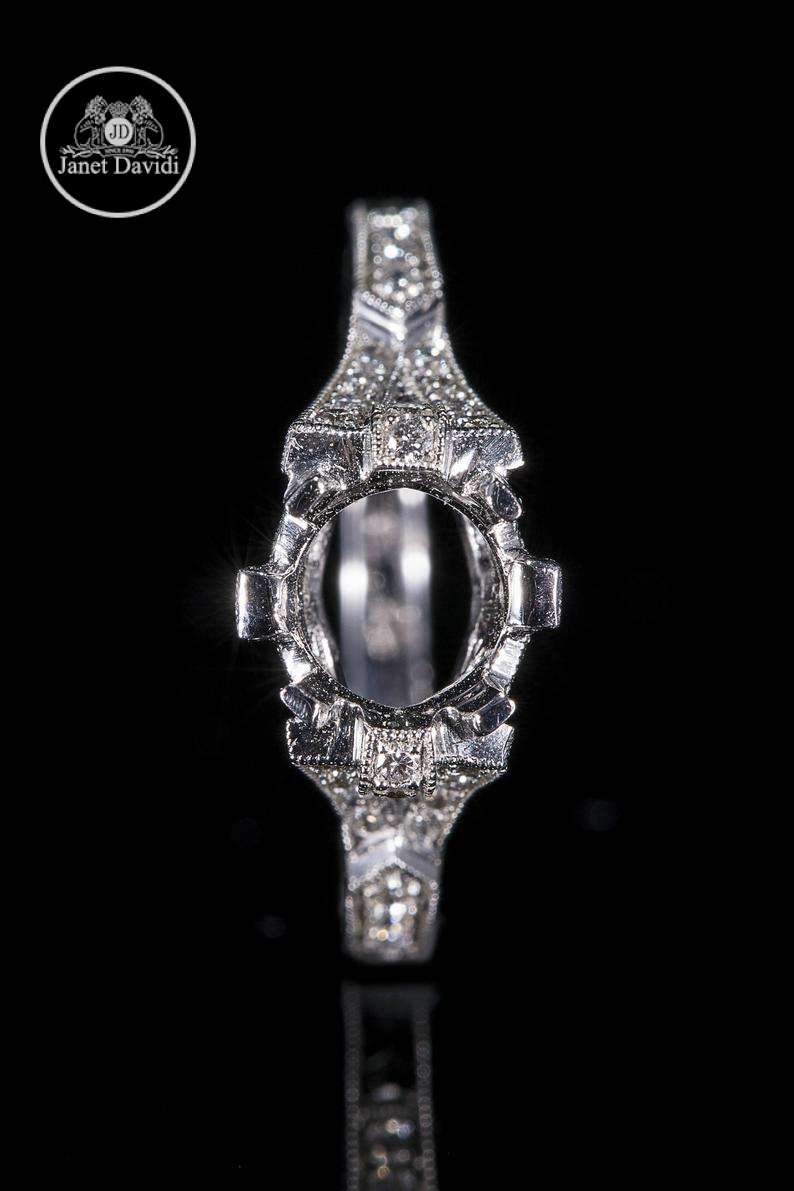 Our artistic, Art Deco-inspired semi mount features 0.25 carats of pave-set VS2-SI clarity, G-H color diamonds. Metal details include milgrain, engraving, and a stunning gallery. The prongs have alternating areas of satin and diamonds giving this ring a look that is as unique as your bride-to-be.