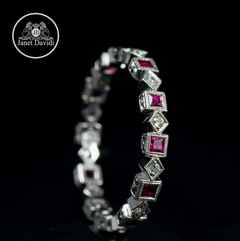 Mill-Grained, Bezel Set Princess Cut and Micro Pave’ Round Brilliant Cut Diamond Stackable Ring accented by hand engraved sides.has 0.10 ct of vs2-si1 g-h diamond and 0.47 ct of Genuine Ruby or Blue Sapphire set in 18 k white gold also available in yellow and rose gold,it can be made for size 4.5-6.5 for same price it is eternity band.it takes 4 to 6 weeks to make it.(146)