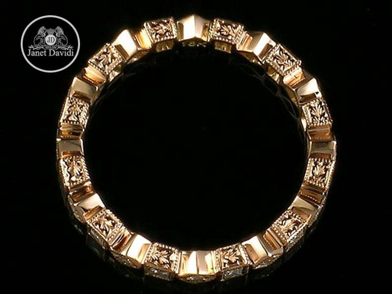 Art Deco style Eternity Band/ 18 WG and Princess Cut and Micro Pave’ Round Cut Diamond Ruby or Blue Sapphire Engraved Stackable Ring/Ring