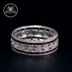 Art Deco Style Eternity Wedding Ring/18K White Gold Diamond and Genuine Ruby Engraved Mill Grained Wide Eternity Band /Eternity Women’s Ring