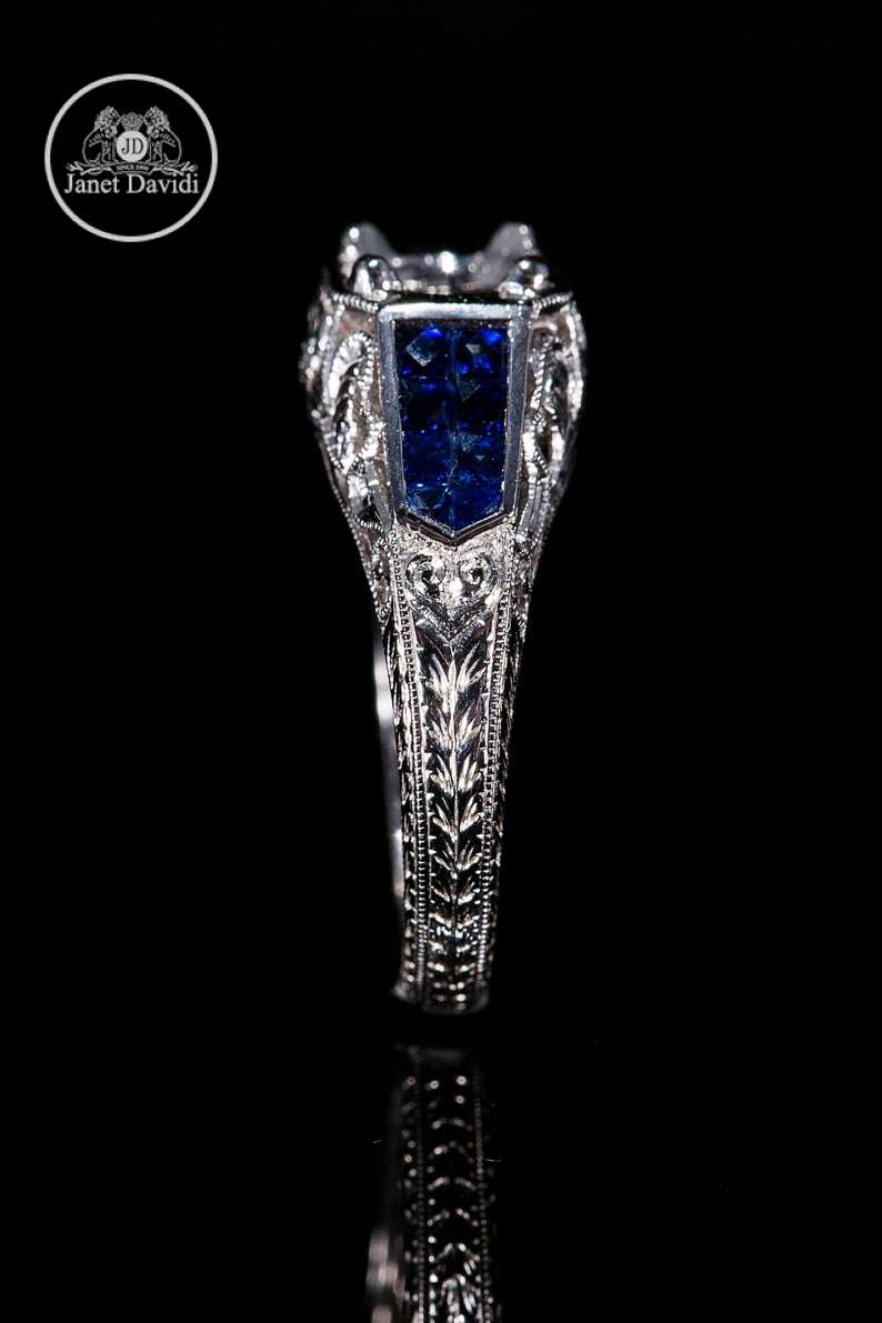 Our esteemed, Art Deco-inspired semi mount features custom-cut genuine blue sapphires set in a hexagonal shape around the center bezel. In addition, this ring includes diamonds in a scalloped pattern. Metal details include milgrain and engraving. Your bride will be delighted each time she looks at her hand, especially when she realizes this can also serve has her something blue on your wedding day!