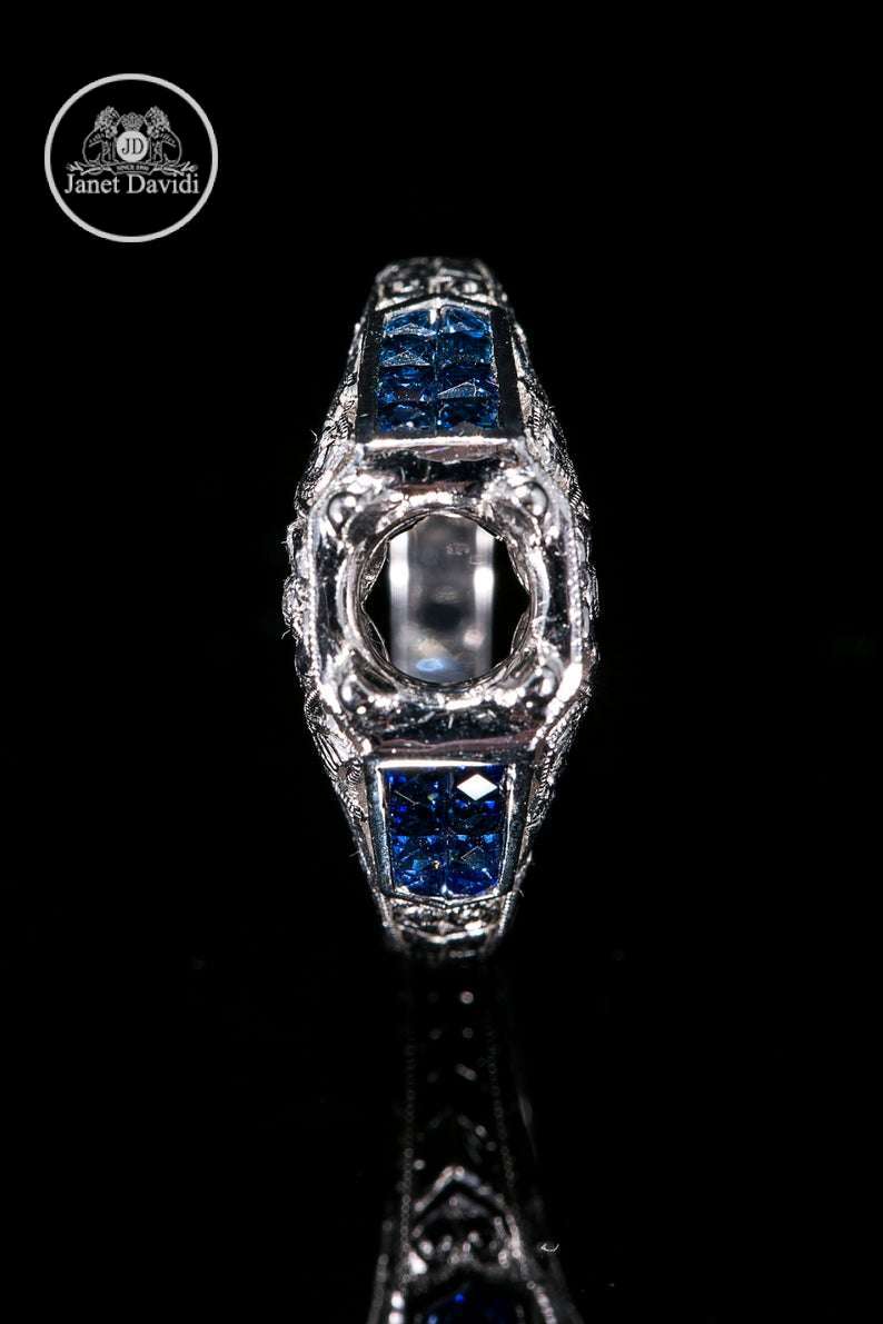 Art Deco Style Vintage Inspired Engagement Ring/Blue Sapphire Diamond Filigree Milgrain Engraved Engagement Ring/Setting Only Semi Mount