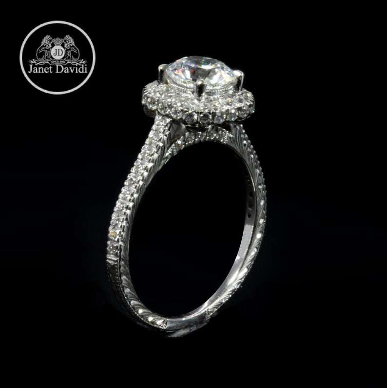 This elegant heirloom quality engagement ring is adorned with a round halo that can accommodate up to a 6.5 mm stone that is as unique as the wearer. The diamonds that surround the halo are continued down the shank of the ring to resemble a wedding veil. The millgrained edge gives this ring a traditional feel that your bride is sure to appreciate.