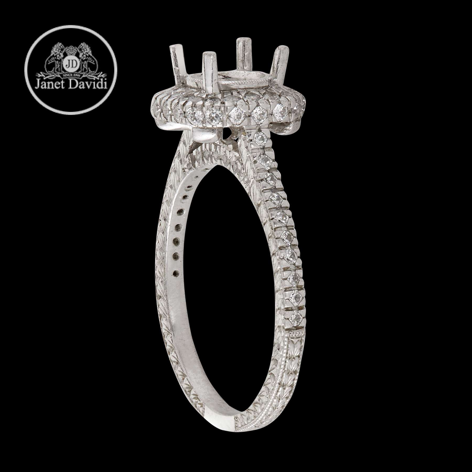 Art Deco Style Vintage-Inspired Engagement Ring, 18K White Gold Pave Diamond Halo Hand Engraved Engagement Ring, Setting Only Semi Mount