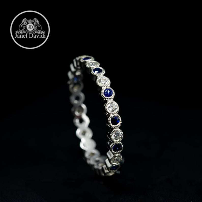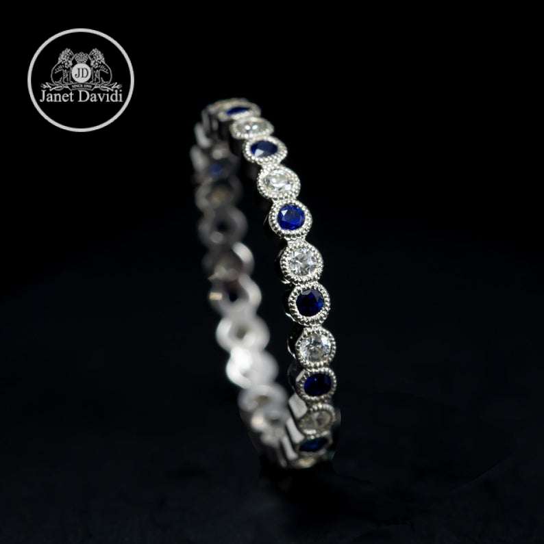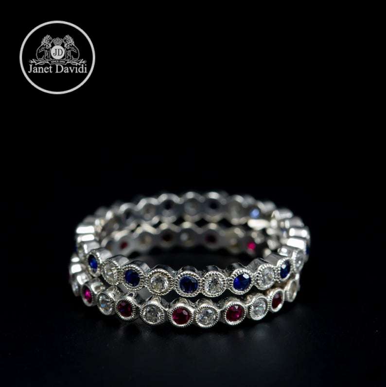 Art Deco Style Wedding Ring/18 KWG Bezel Set Genuine Ruby or Blue Sapphire and Diamond Hand Milgraine Eternity Stackable Band/Narrow Ring