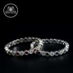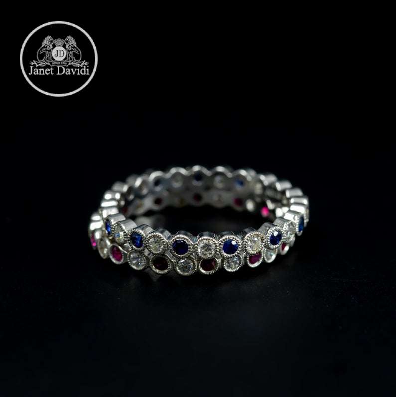This eye catching band has fine mill graining and is bezel wrapped; it is set with diamonds and genuine rubies or genuine blue sapphires. The colors are customized to create the perfect ring for your nontraditional bride! Price listed is for one ring.