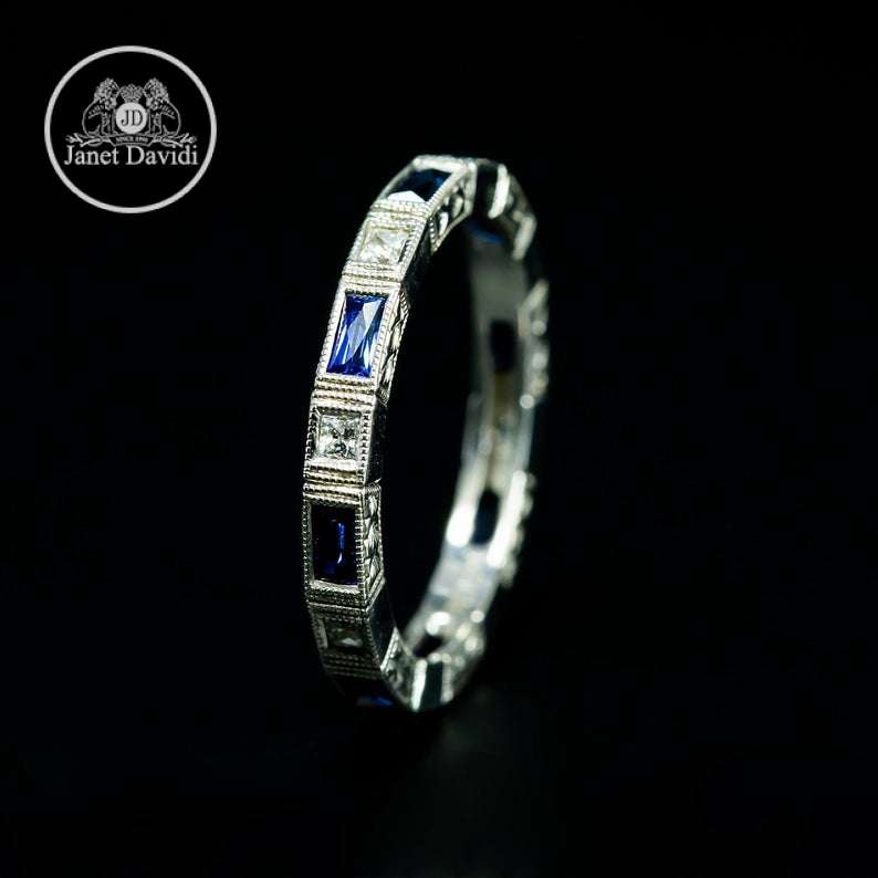 Art Deco Style Wedding Ring/18 KWG Bezel Set Genuine Blue Sapphire Baguette And Princess Cut Diamond Mill Grained And Engraved Eternity Band