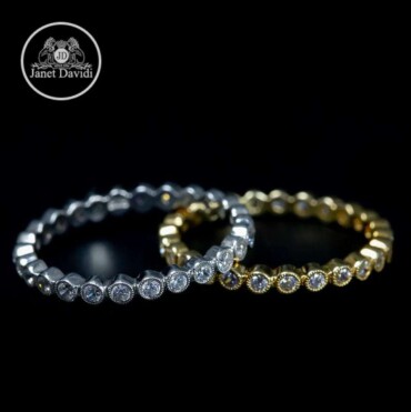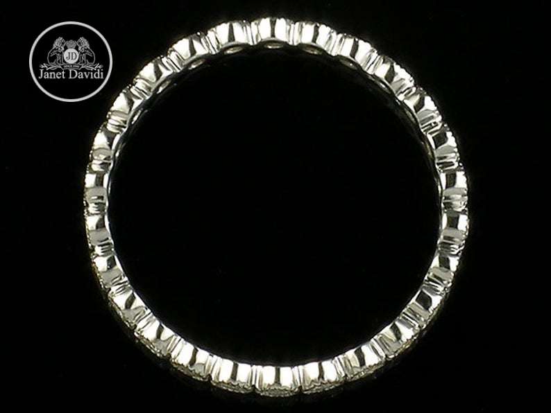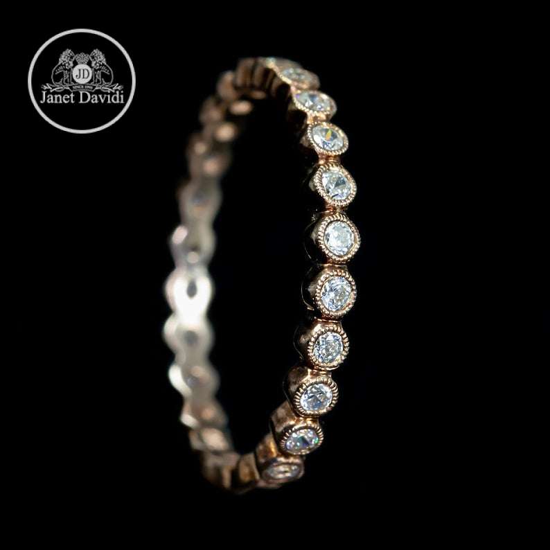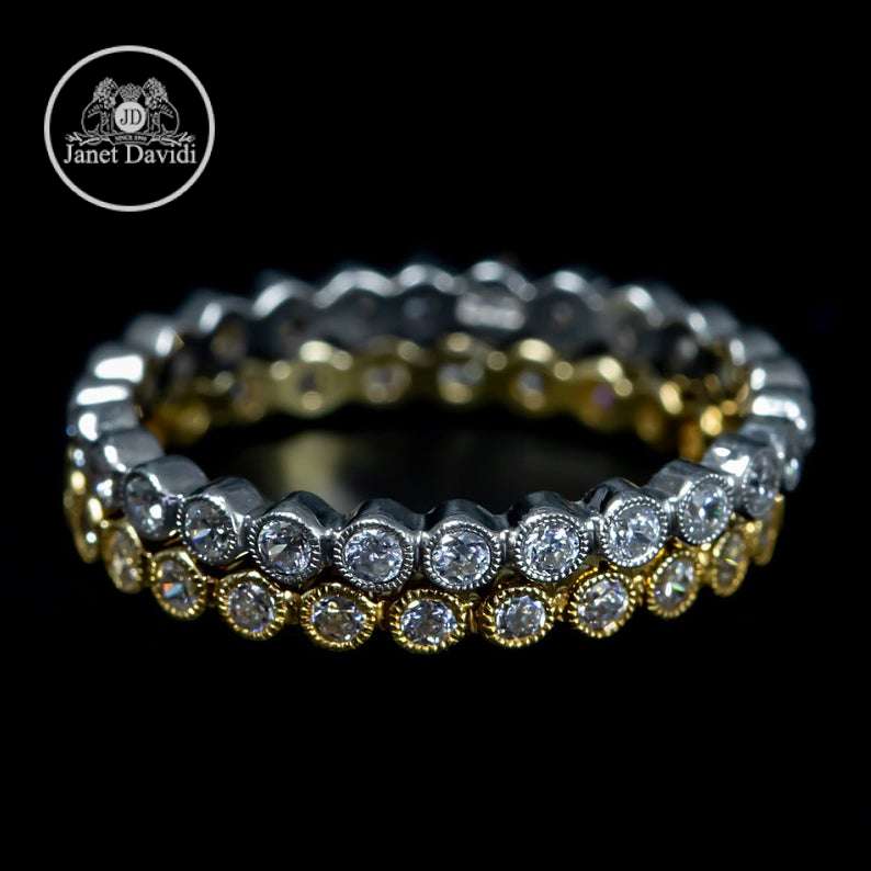 This eye catching eternity band is mill grained and bezel wrapped. We can create it for you in either 18k white, yellow or rose gold. The price listed is for one ring only