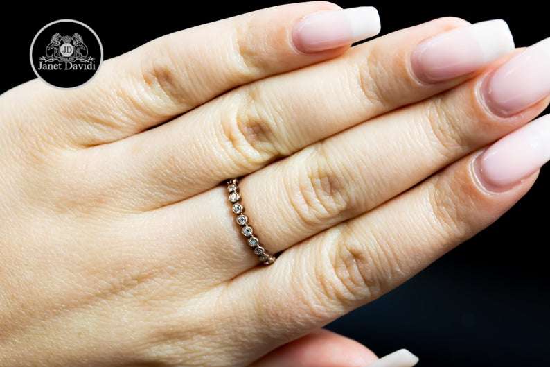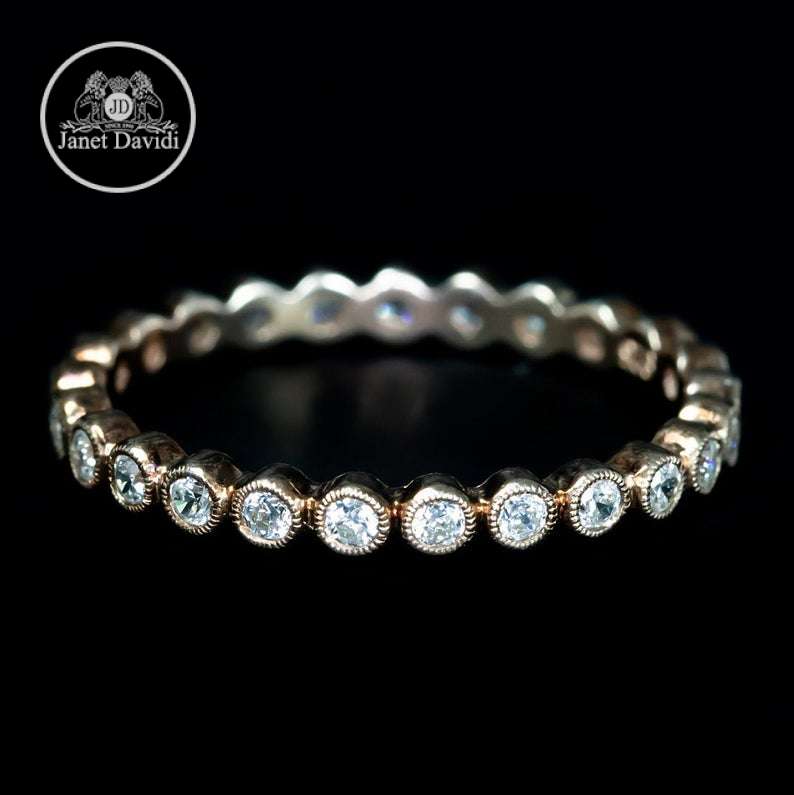 Antique Inspired Art Deco Style Wedding Ring/18 K Gold Bezel Set Diamond Mill Grained Stackable Eternity Wedding Band/Narrow Wedding Ring