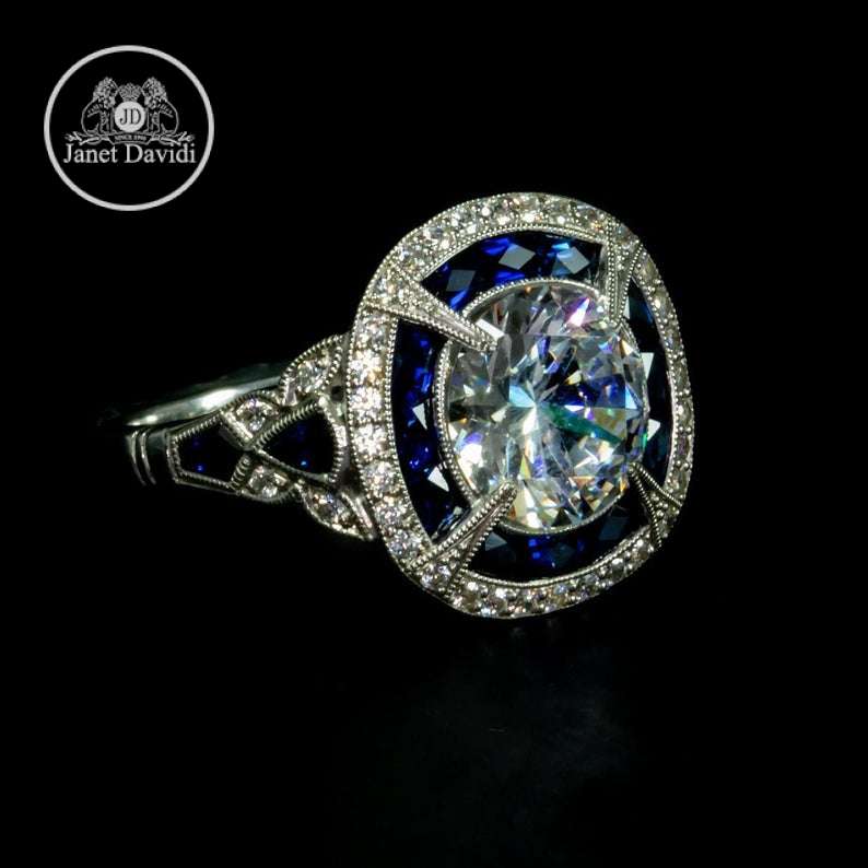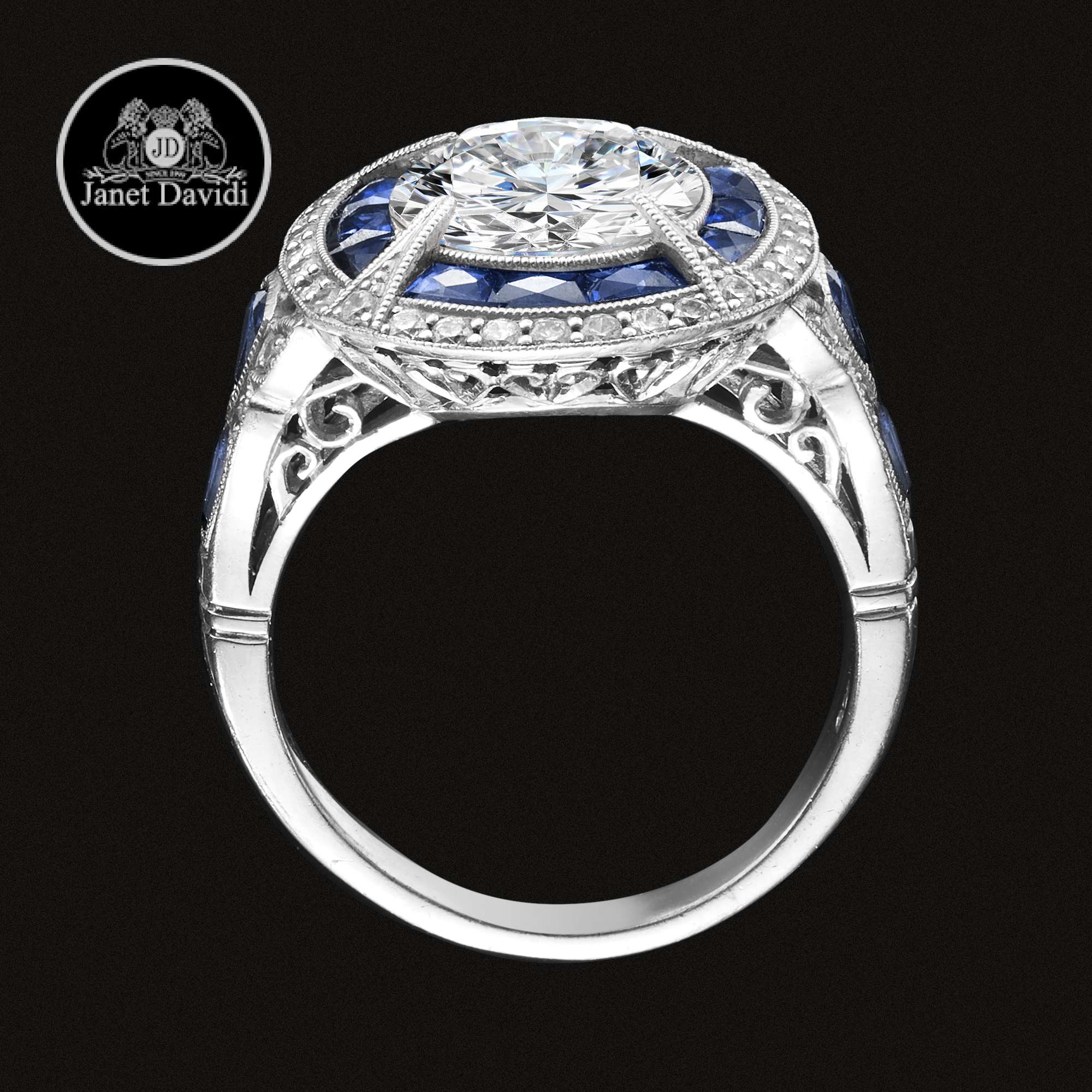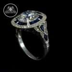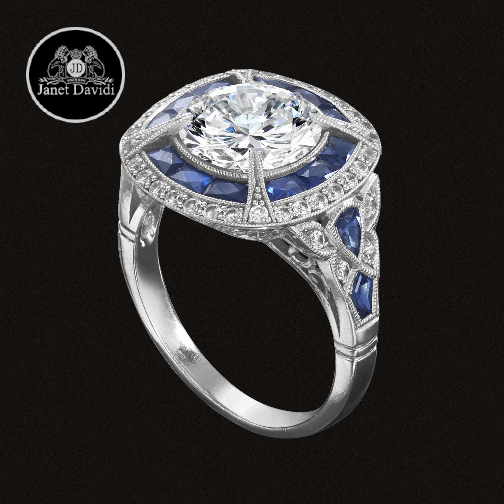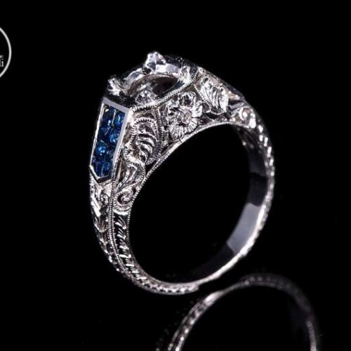 Our architectural, Art Deco-inspired semi mount includes 1.30 CT of custom genuine blue sapphires. It’s breathtaking features are reminisces of walking into a grande foyer of a royal palace.
