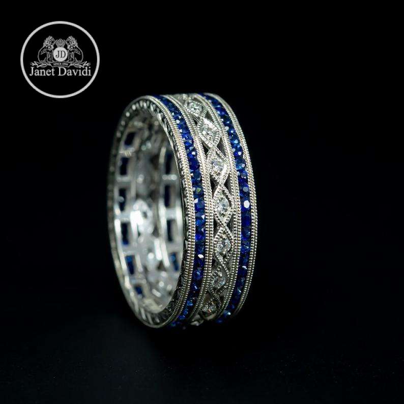 Art Deco Style Eternity Wedding Ring/18 K W Gold Diamond and Genuine Blue Sapphire Hand Engraved Wide Eternity Band/Eternity Women’s Ring