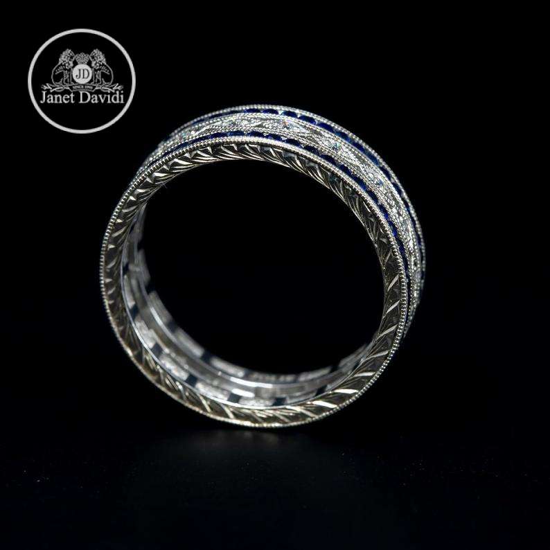 this beautiful eternity Art Deco style wide band has 0.13 of vs2-si1 g-h diamond and 1.14 ct of genuine blue sapphire is handmade also hand engraved and mill grained over 120 stones has been used for this band, great workmanship and piece of art Craftsmanship Completed in this ring ,absolutely unique and price is so great, size 4.00 with slightly different design is in stock other sizes can be ordered.(3035)