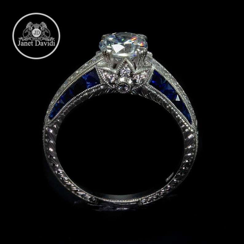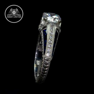 Our architectural, Edwardian-inspired semi mount includes princess-cut, channel-set genuine blue sapphires. The side profile of this ring features a three-petal diamond flower. As the years pass she’ll be reminded of her wedding bouquet each time she looks at her hand.