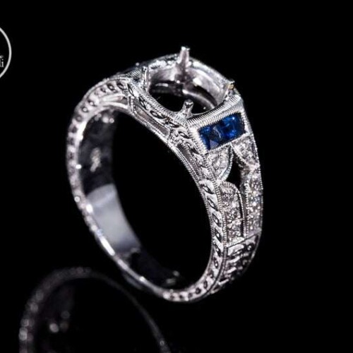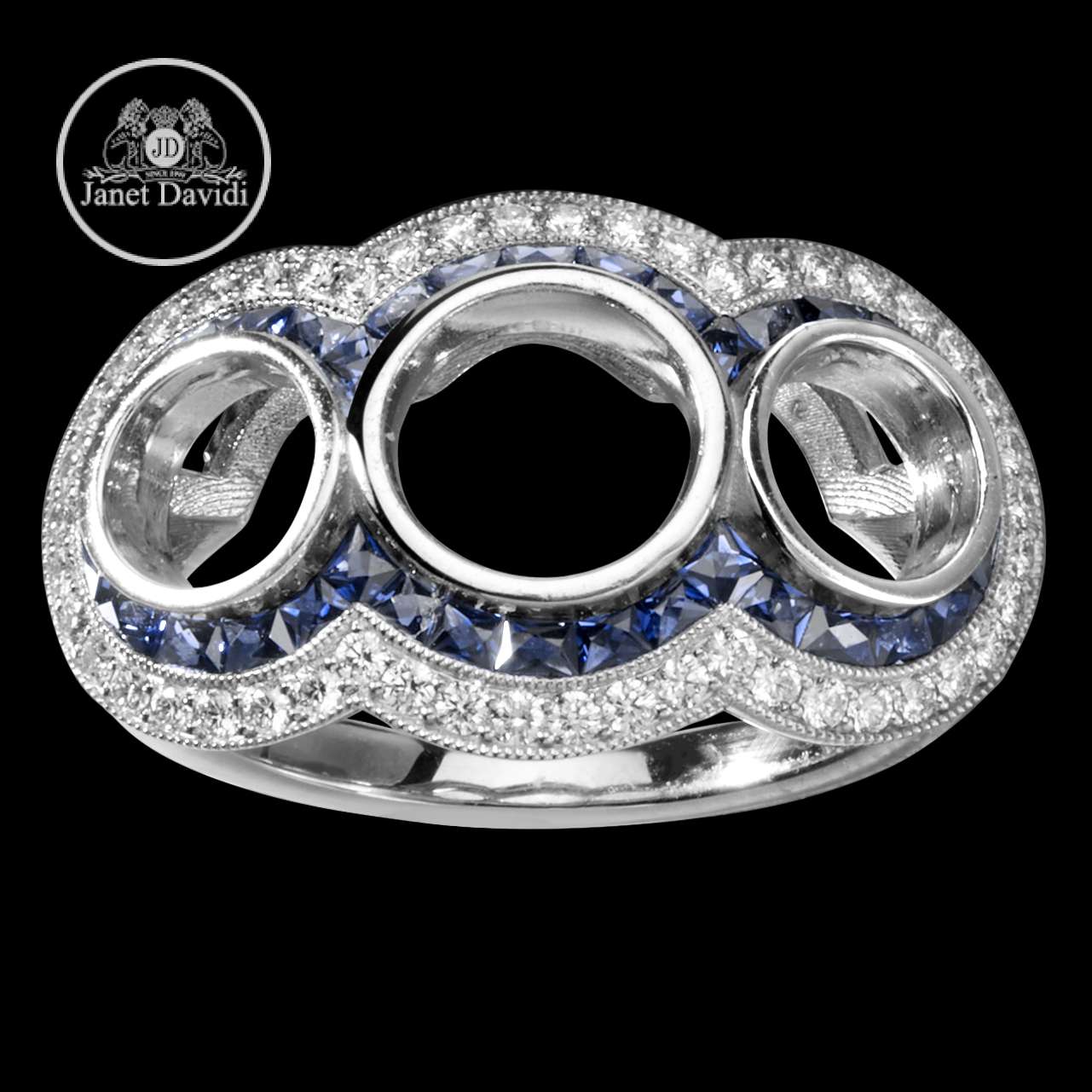 Art Deco Style Antique Inspired 3 Stone Engagement Ring, Diamond and Genuine Blue Sapphire Milgrain Hand Engraved platinum Three Stone Ring , Setting Only