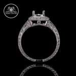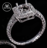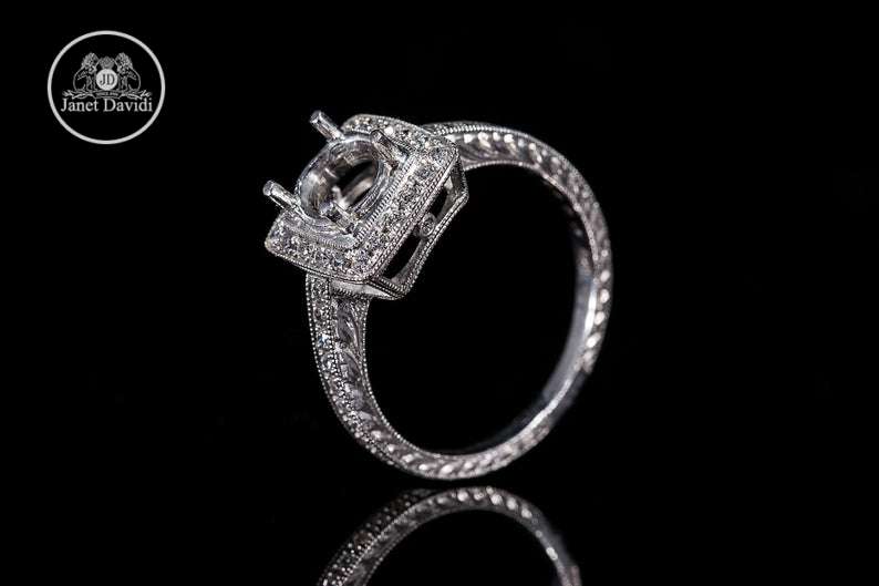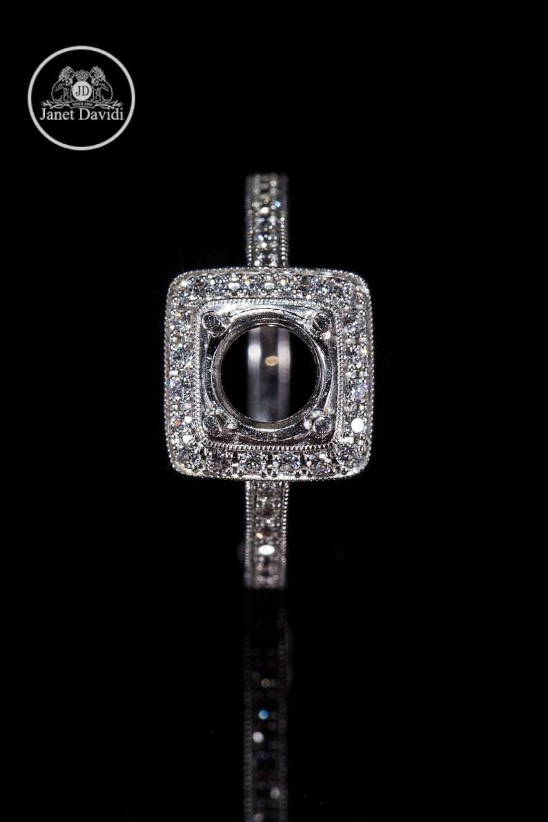 Our vintage-inspired semi mount with halo includes hand crafted metal details of engraving and milgrain. This ring is as timeless as your bride-to-be. Silver sample is available upon request.