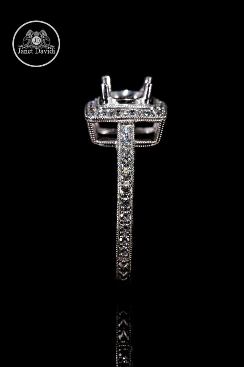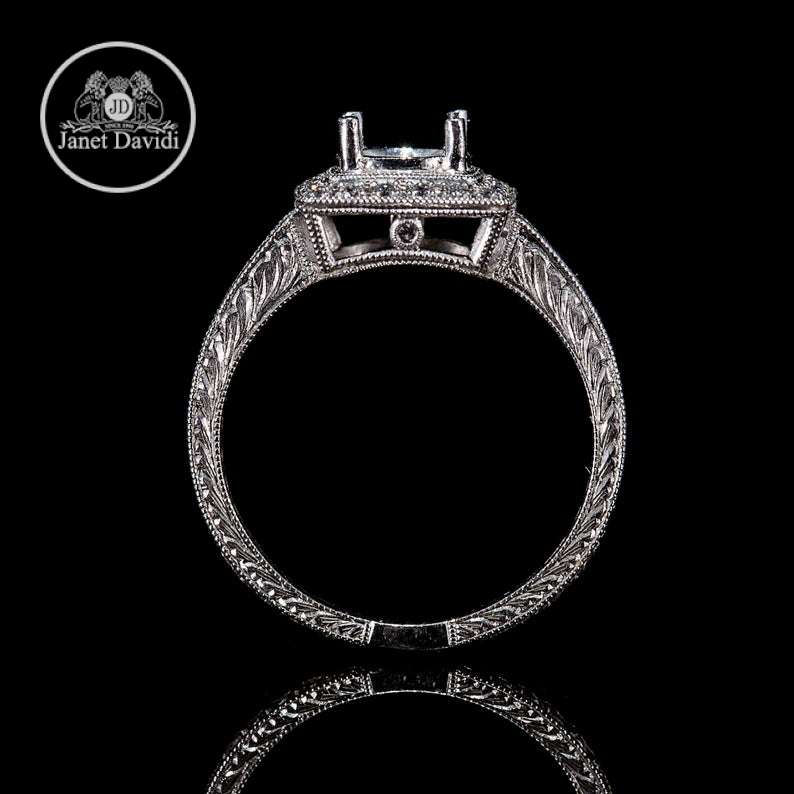 Edwardian Style Vintage Inspired /14 or18K White Gold Pave Diamond Halo Milgrain and Engraved Engagement Ring/Setting Only Semi Mount Ring