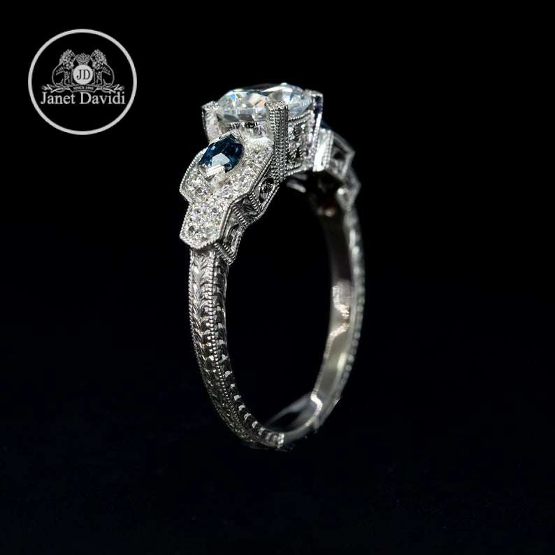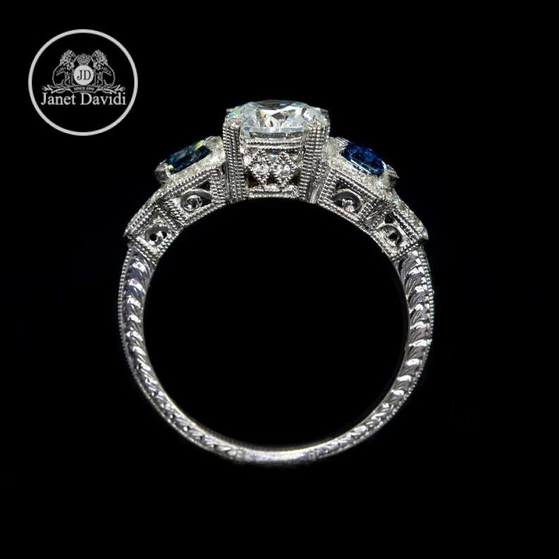 Our artful, Edwardian-inspired semi mount features two custom-cut genuine blue sapphires, one on either side of the center stone. This whimsical addition of color is sure to make your bride smile.
