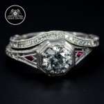 This handcrafted engagement ring has beautiful scroll work along the shaft. The added genuine ruby gives this engagement ring a touch of playfulness, the perfect symbol of your bride. This wedding set also available in tsavorite and blue sapphire.