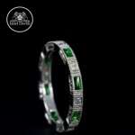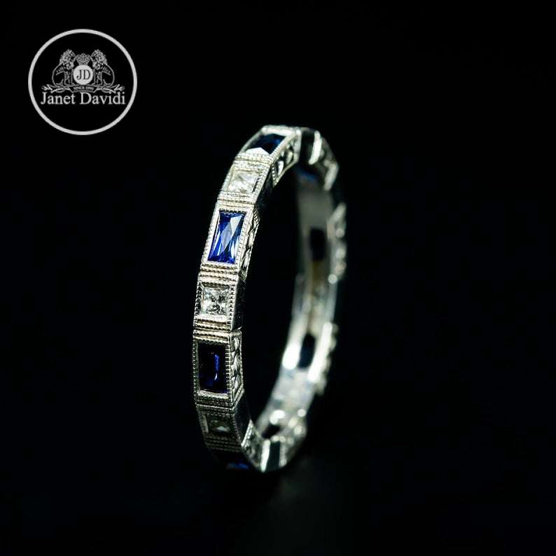 Bezel Set Baguette Blue Sapphires and Princess Cut Diamonds surrounded by mill-Graining and Hand Engraving.has 0.20ct of vs2-si1 g-h diamond and 0.52 ct of genuine gemstone, available in Ruby or Tsavorite and blue sapphire all set in 18k white gold. This ring can be ordered in yellow and rose gold. Price listed is for one ring only.(149)