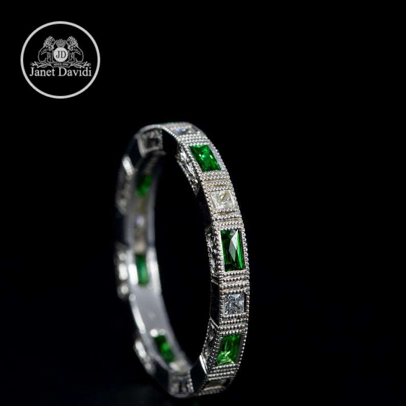 Art Deco Style Wedding Ring/18 KWG Bezel Set Genuine Baguette Gemstone And Princess Cut Diamond Mill Grained Engraved Eternity Band/Ring