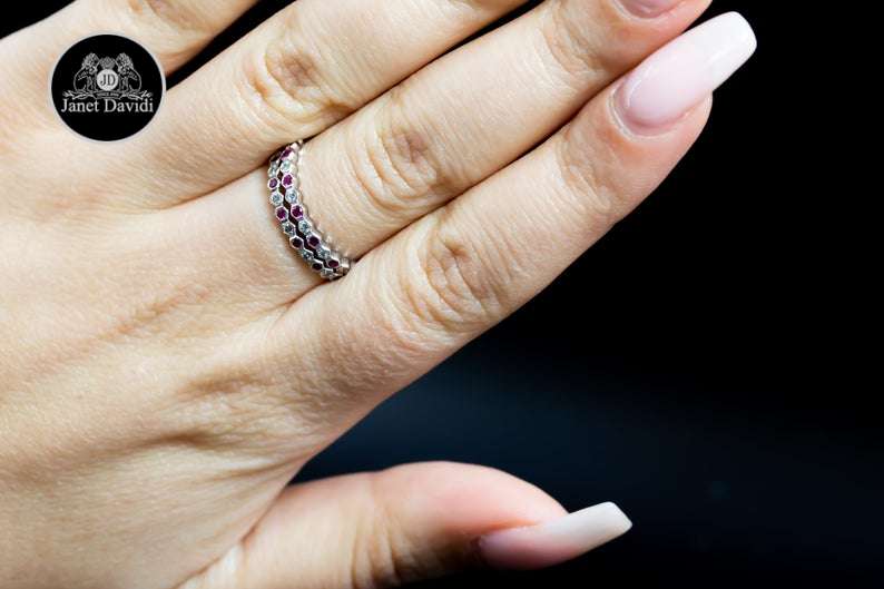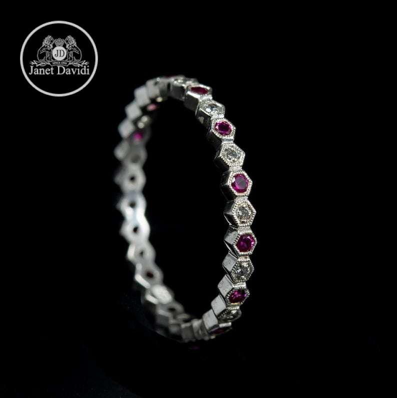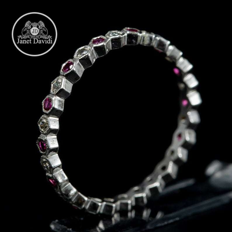 Art Deco Style Wedding Ring/18 K Gold Bezel Set Diamond and Genuine Ruby Mill Grained Honey Comb Stackable Eternity Wedding Band/Narrow Ring