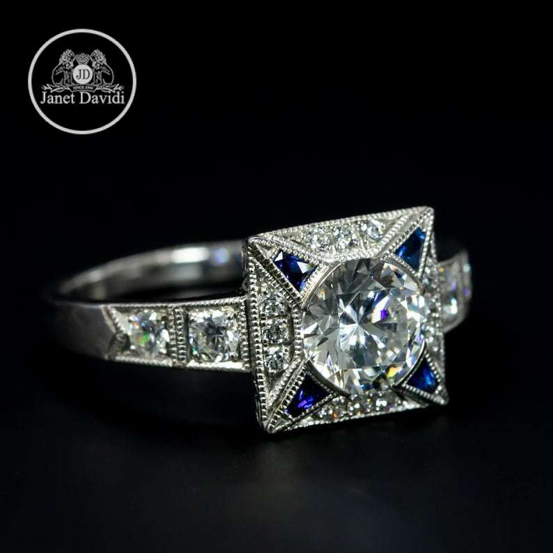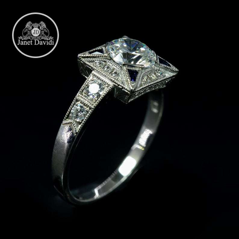 Our architectural, Art Deco-inspired semi mount empathizes the center stone with a pool of genuine blue sapphires surrounding it. The detail work along the shank is a reflection of our traditional handcrafted style. Your bride’s eyes will light with delight at this unique ring.