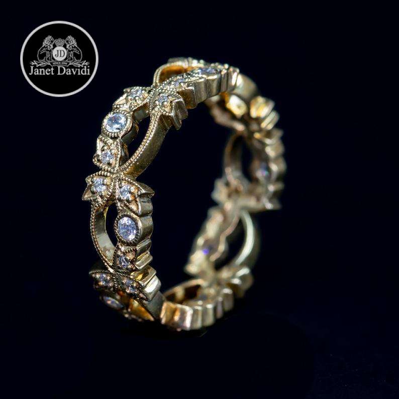 Leaf Diamond Stackable Wedding Ring/18 K Yellow Gold and Round Brilliant Cut Diamonds Mill Grained Eternity Band/Stackable Gold Wedding Ring