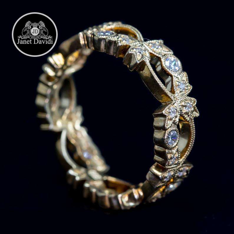 This remarkable ring was inspired by nature. It’s intricate vine pattern forever ties two separate lives together into one. It is set with Round Brilliant Cut Diamonds in 18K yellow Gold.