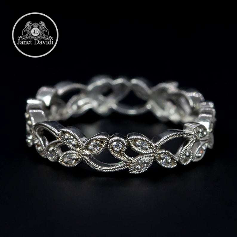 Nature Inspired Stackable Wedding Ring/18 KG and Diamond Floral Vine Mill Grained Eternity Wedding Ring/Floral Engagement Ring/Wedding Band