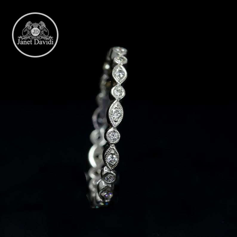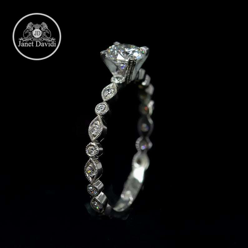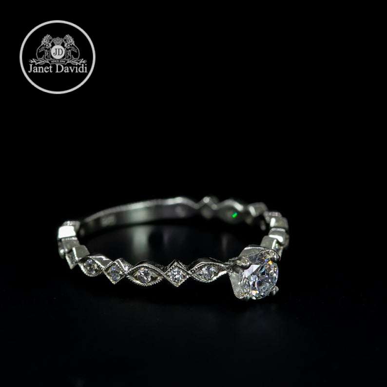 This dainty engagement ring has a playful pattern of a round and marques shaped band studded with round diamonds. It is simple, yet elegant and is sure to bring a smile to your beautiful bride’s face when you present it to her!