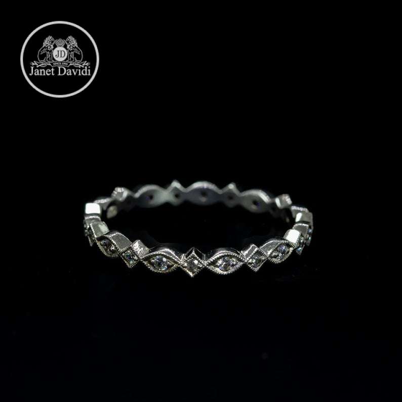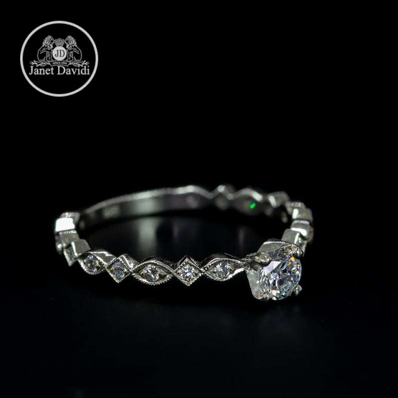 This dainty engagement ring has a playful pattern of a round and square shaped band studded with round diamonds. It is simple, yet elegant and is sure to bring a smile to your beautiful bride’s face when you present it to her! The matching band is not included in the pricing, but can be ordered separately.
